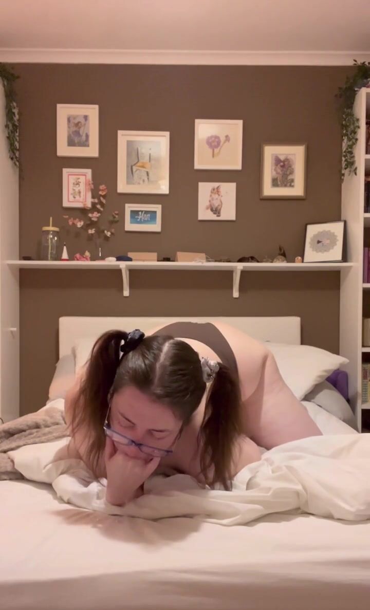 Busty Brunette in Pigtails Gags All Over Her Fingers, Making a Mess