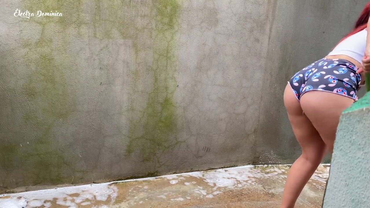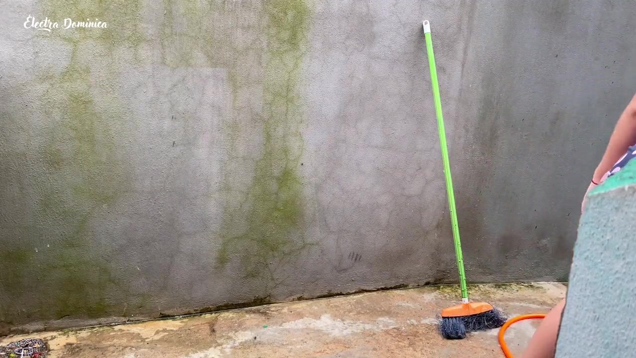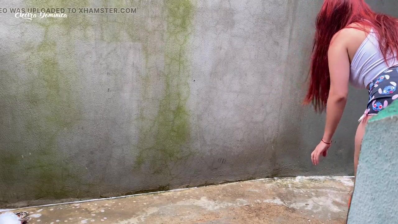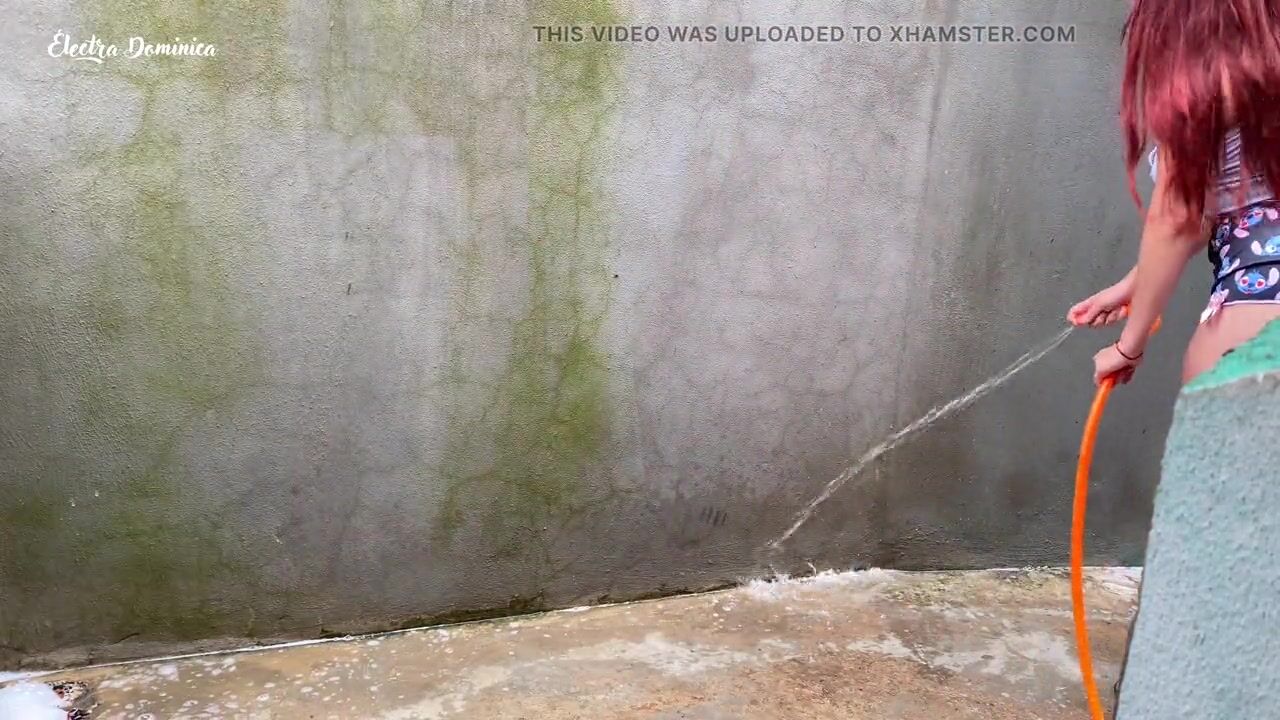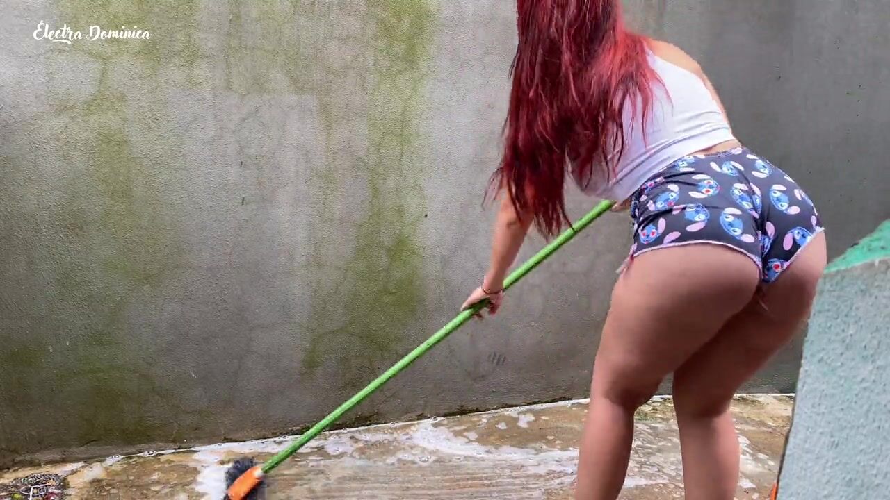 Maid in pajamas cleaning the yard